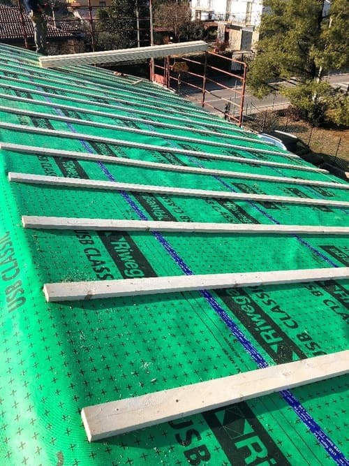 Molto importante la struttura del sistema copertura oltre che per la parte termica anche per quella di tenuta all’aria con sistema a doppio tetto e posa di teli a tenuta aria/acqua opportunamente nastrati.